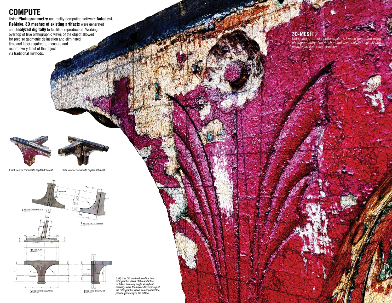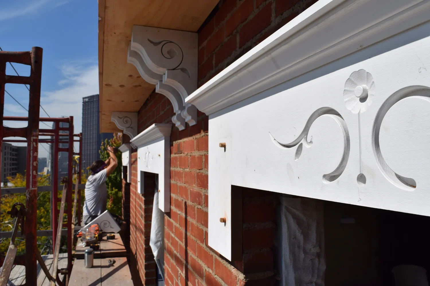 Programmatically, the studio utilized three modes of practice: 1) RECONNAISSANCE including historical research and analysis of existing conditions with advanced capture technology; 2) VIRTUAL RECONSTRUCTION using enhanced digital workflows and physical prototyping to resolve project design and construction documents; and 3) PREFABRICATION of full-scale, integrated construction that represents value to society. Victorian elements of the facade designed/restored by the design build studio included: 1) Upper Cornice and Box Gutter, 2) Upper Brackets, 3) Window Hoods, 4) Storefront Cornice and Signboard, 5) Storefront, 6) Pilasters. Spiritually, the studio aspired to manifest the spirit of Wilson’s “Pittsburgh Cycle” series of ten plays through development of storytelling tools and engagement practices that link technical dimensions to pride in place, prospect for home, and the aspiration of scaffolding socio-economic mobility.